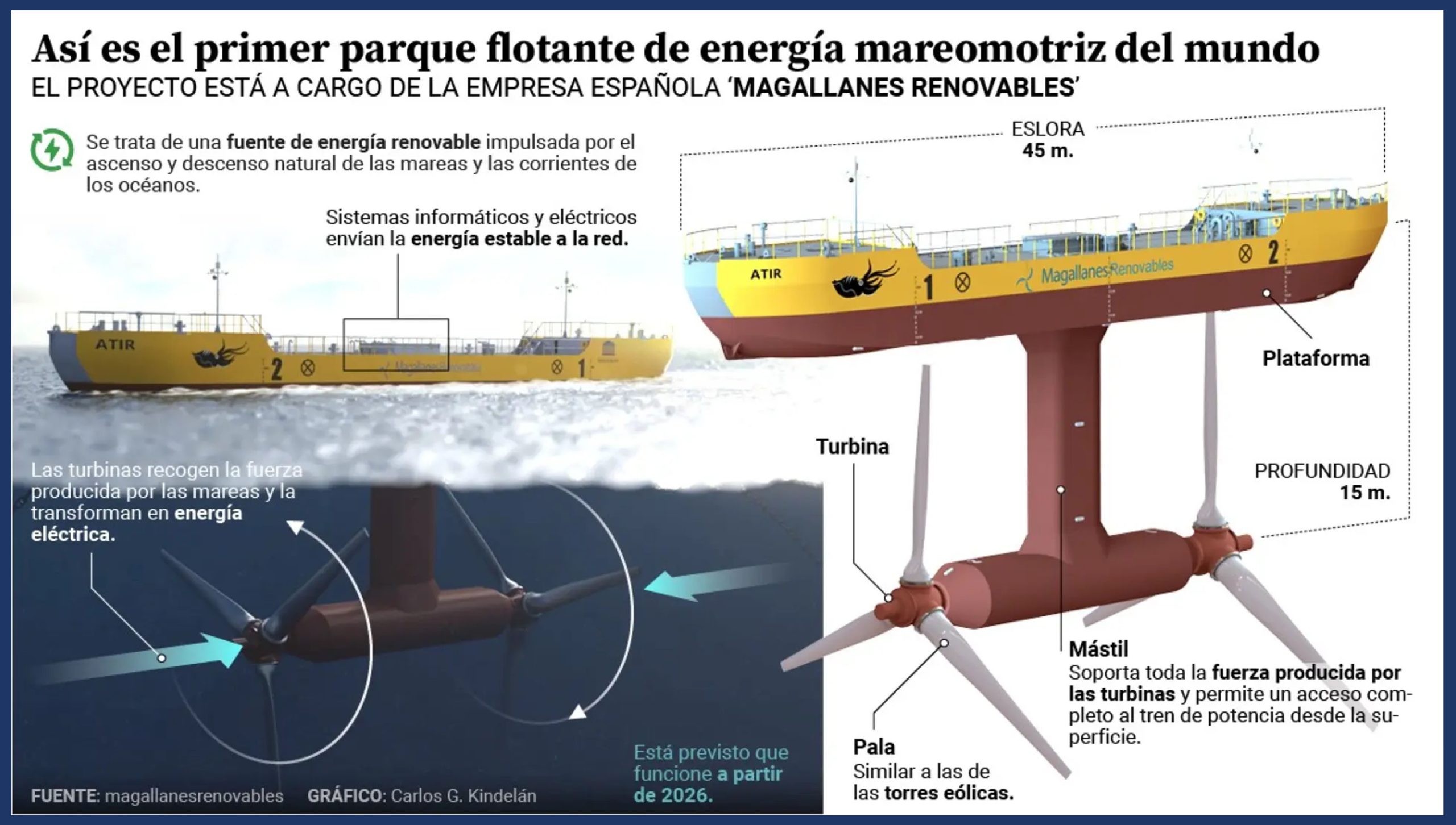 Estamos de enhorabuena, se acaba de obtener de Reino Unido el respaldo necesario para la instalación del que será el primer parque flotante de energía mareomotriz del mundo. En esa futura infraestructura cuatro plataformas generarán y distribuirán la energía obtenida del mar. Está previsto que funcione a partir de 2026.